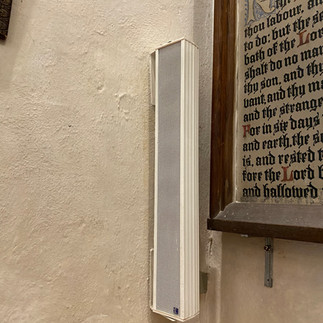 This month we were delighted to be able to help out Chiddingly Church who called us in to upgrade their PA system. The old sound system was rather dated and consisted of four 100v column loudspeakers. The system lacked flexibility so it was difficult to be able to line in a phone, laptop or other media in order to play music for weddings, funerals or other events. The church asked us to look at upgrading their system so something which would improve sound quality, allow connections to modern media and get the hearing loop working again. We went away and put forward a proposal and got the go ahead and started work!